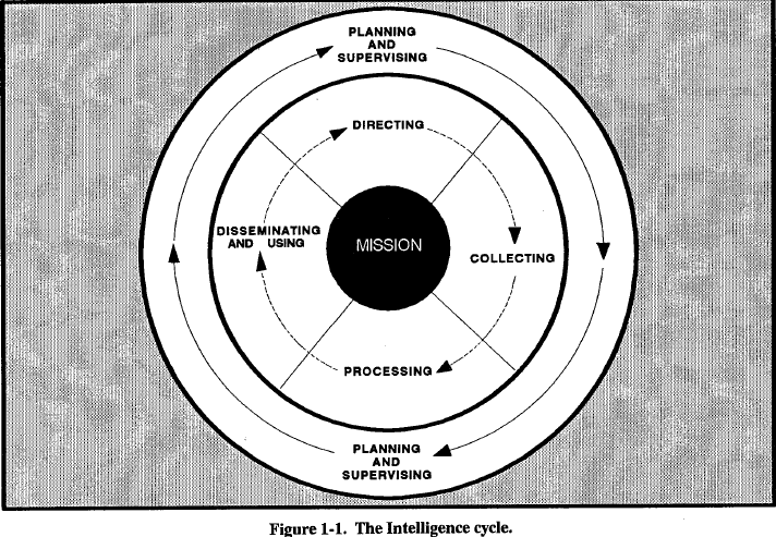 The commander uses defensive and offensive operations to destroy enemy first-echelon forces and deep-attack to simultaneously delay, disrupt, and manipulate enemy follow-on forces. The commander anticipates, creates, and exploits windows of opportunity, using flexible battle planning, to gain the initiative through offensive operations. By effectively employing maneuver and fire support assets, manipulating the enemy, and expertly using the weather and the terrain, the friendly commander can successfully defeat a superior enemy force. OPERATION DESERT STORM is an example of the successful application of this doctrine. IEW support is vital to the successful planning and execution of battlefield operations at all echelons. Intelligence support at brigade and battalion levels focuses primarily on close operations, while at division it focuses on close and deep operations. Corps is the focal point for intelligence operations that support rear and deep operations. Intelligence operations follow a four-phase process known as the intelligence cycle, which is shown at Figure 1-1. The intelligence cycle is oriented to the commander's mission. Supervising and planning are inherent in all phases of the cycle. Figure 1-1. The Intelligence cycle. The intelligence cycle is continuous. Although the four phases are conducted in sequence, all are conducted concurrently. While available information is processed and additional information is collected, the intelligence staff is planning and directing the collection effort to meet new demands. Previously collected and processed information (intelligence) is disseminated as soon as it is available or needed. The IEW system includes three MI disciplines: signals intelligence (SIGINT), imagery intelligence (IMINT), and HUMINT. Intelligence interrogation falls within the realm of HUMINT. SIGINT is derived from the intercept, analysis, and exploitation of threat communications and noncommunications radio- electronic emissions. IMINT is obtained from the analysis of radar, photographic, infrared, and electro-optical imagery. HUMINT is obtained from information collected from human sources and consists of the following intelligence collection operations: