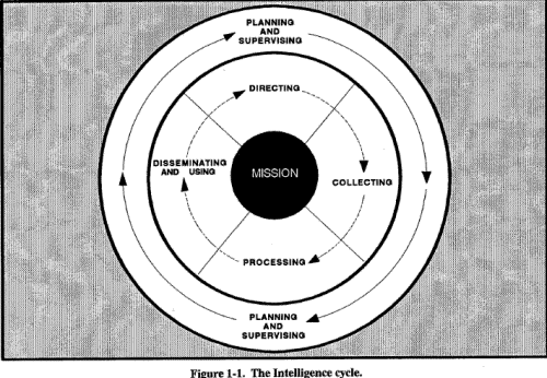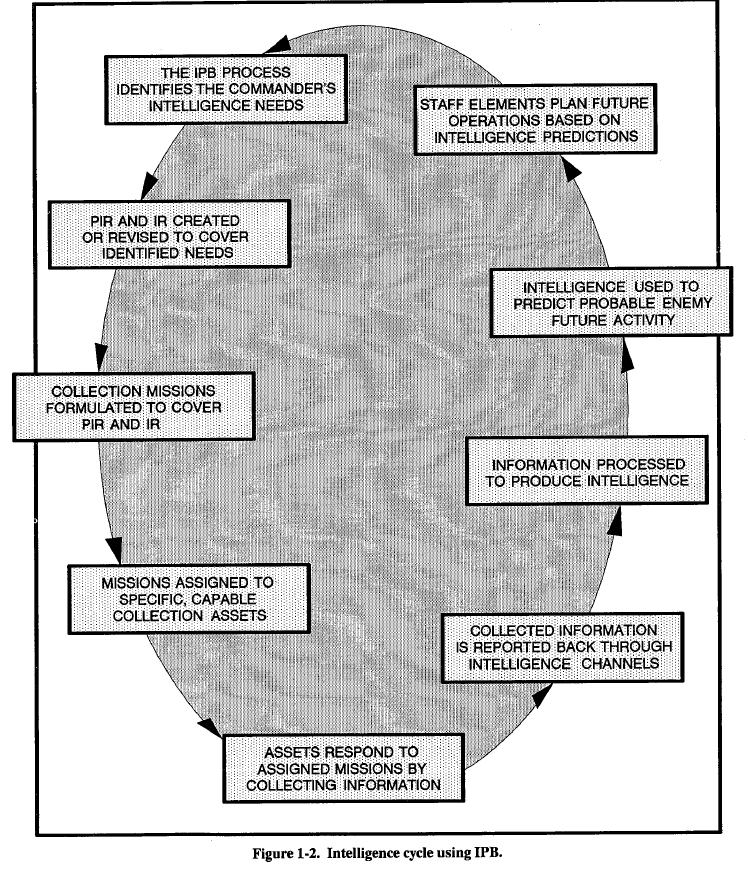 In mid-intensity conflict (MIC) to high-intensity conflict (HIC), IPB focuses on the traditional aspects of terrain, weather, and enemy. Many of the factors evaluated in IPB at the strategic level are used during IPB for low-intensity conflict (LIC) at the operational and tactical levels. Social, economic, and political factors that affect the environment of conflict are considered in IPB. The population must be examined in as much detail as the enemy and the terrain to understand what an enemy can or cannot do. Figure 1-2 shows the intelligence cycle using IPB.