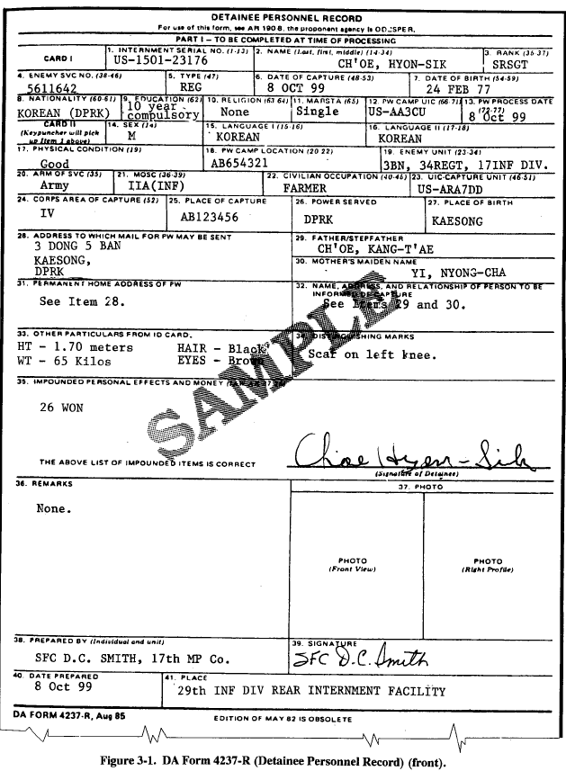 Screeners should obtain a copy of the element's overall objective statement from the PIR, IR, and SIR and become familiar with the intelligence indicators listed there. Screeners must use their experience and imagination to devise ways to identify EPWs and detainees who might possess information pertinent to these indicators. For example, one group of indicators may concern new enemy units moving along a specific avenue of approach. In this case, a screener may want to concentrate first on screening EPWs and detainees captured near that location. When he questions those EPWs or detainees, the screener might try to determine what units are due to arrive in that area in the near future. The ability to recognize branch of service and rank insignia can be of great assistance to screeners. Screeners coordinate with MP holding area guards on their role in the screening process. The guards are told where the screening will take place, how EPWs and detainees are to be brought there from the holding area, and what types of behavior on their part will facilitate the screenings. If time permits, screeners should go to the holding area and examine all available documents pertaining to the EPWs and detainees. They should look for signs that certain EPWs and detainees are willing, or can be induced, to cooperate with the interrogator. Previous screening and interrogation reports and EPW personnel records are important. Interrogation reports identify EPWs and detainees who have been cooperative in the past. Prior screening reports indicate EPWs and detainees who appear cooperative. During EPW inprocessing, MPs prepare a DA Form 4237-R, which is prescribed by AR 190-8. A sample is shown at Figure 3-1. DA Form 4237-R contains additional information not required by the GWS, GPW, and GC, but which the EPWs and detainees may have volunteered during inprocessing. The volunteering of information is one indicator of EPW's or detainee's cooperation. When examining documents, screeners should identify topics on which EPWs and detainees have pertinent information. Screeners should make a note of any documents captured with specific EPWs and detainees that may contain indications of pertinent knowledge and potential cooperation. If time permits, screeners should question holding area personnel about the EPWs and detainees. Since these personnel are in almost constant contact with the EPWs and detainees, their descriptions of specific ones can help identify sources who might answer the supported commander's PIR and IR. Screeners should identify and note those EPWs and detainees whose appearance and behavior indicate they are willing to cooperate immediately or are unlikely to cooperate ever. Unless time is critically short, screeners should --