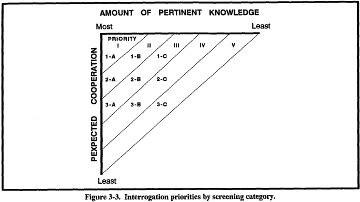 Screeners should always try to screen cooperative knowledgeable EPWs and detainees first. These include EPWs and detainees identified during the screener's review of documents, questioning of holding area personnel, and their own personal observations. Based on screener notes and recommendations, they establish the order which EPWs and detainees will be questioned. The holding area guards are then told to bring these EPWs and detainees, in order, to the screening site one at a time. A screener must use a screening report to record information as it is obtained from the source. Figure 3-2 is a format for a screening report. All information shown is rarely obtained from any one source. The blocks save the screener as much additional writing as possible. If PIR, IR, and SIR information is obtained, it is spot reported in SALUTE formal. When this type of information is obtained during screening, it must be exploited fully and reported as soon as possible. Source screening ends when the screener is sure he can make an accurate assessment of the source's potential cooperation and pertinent knowledge. At this time, the source is returned to the control of the guards, and the screener records his assessment on the screening report. The assessment is recorded using a screening code. The screening code is an alphanumeric designation which reflects the level of cooperation expected from the source and the level of knowledgeability the source may possess. Table 3-1 shows the codes for assessing sources. Those sources who have been assigned to the same category may be interrogated in any order deemed appropriate by the senior interrogator. Category 1A sources normally should be the first to be interrogated; Category 1B, next; followed by those assigned to categories 2A, 1C, 2B, 3A, 2C, and 3B. Category 3C sources are normally interrogated last. This order ensures the highest probability of obtaining the greatest amount of pertinent information within available time. Screening codes may change with the echelon. The higher the echelon, the more time is available to conduct an approach. Figure 3-3 shows the order in which sources will be interrogated. The term "screening category" should not be confused with the categories that are assigned to EPWs and detainees based on their intelligence value. Table 3-1. Instructions for assessing sources.