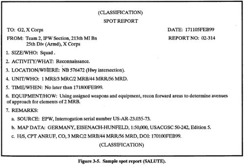Questions should be presented in a logical sequence to avoid neglecting significant topics. A series of questions following a chronological sequence of events is frequently employed, but this is not the only logical method of asking questions. Adherence to a sequence should not deter the interrogator from exploiting informational leads as they are obtained. The interrogator must consider the probable response of the source to a particular question or line of questioning and should not, if at all possible, ask direct questions likely to evoke a refusal to answer or to antagonize the source. Figure 3-5. Sample spot report (SALUTE). Experience has shown that in most tactical interrogations, the source is cooperative. In such instances, the interrogator should proceed with direct questions. Good, direct questions --