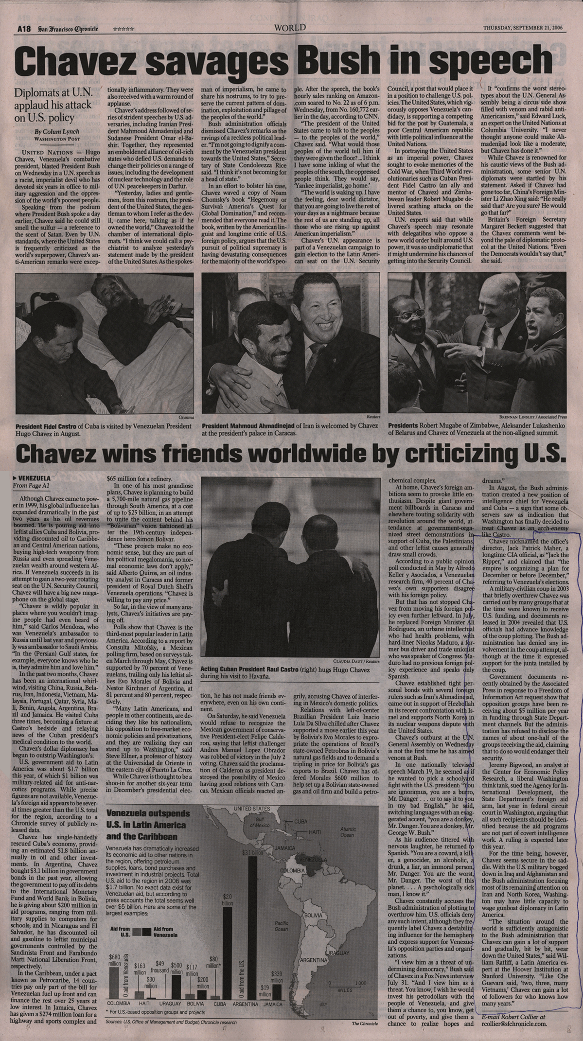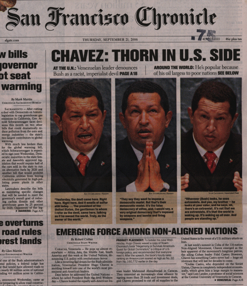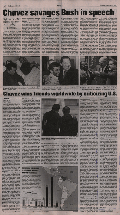 by Robert Collier, San Francisco Chronicle San Francisco Chronicle CHAVEZ'S ANTI-U.S. FERVOR Thursday, September 21, 2006 Like a recurring bad dream for the Bush administration, Venezuelan President Hugo Chavez is molding himself into one of the world's most pre-eminent anti-American leaders. Days before he addressed the United Nations -- where he called President Bush the devil Wednesday -- Chavez hosted the equally anti-American Iranian leader Mahmoud Ahmadinejad in Caracas. They cemented an increasingly close alliance by signing more than 20 trade and investment deals, and Chavez promised to cut off oil supplies to the United States in the event of a U.S. military attack on Iran. At last week's summit in Cuba of the 116-nation Non-Aligned Movement, Chavez emerged as the heir apparent of the movement's longtime patron, the ailing Cuban leader Fidel Castro. However, Chavez has something Castro never had -- huge oil revenues that will last for decades to come. "Unlike Castro, who depended on the Soviet Union, Chavez is completely independent economically, which gives him a large margin to maneuver," said Luis Lander, a professor of social sciences at the Central University of Venezuela in Caracas. Although Chavez came to power in 1999, his global influence has expanded dramatically in the past two years as his oil revenues boomed. He is pouring aid into leftist allies Cuba and Bolivia, providing discounted oil to Caribbean and Central American nations, buying high-tech weaponry from Russia and even spreading Venezuelan wealth around western Africa. If Venezuela succeeds in its attempt to gain a two-year rotating seat on the U.N. Security Council, Chavez will have a big new megaphone on the global stage. "Chavez is wildly popular in places where you wouldn't imagine people had even heard of him," said Carlos Mendoza, who was Venezuela's ambassador to Russia until last year and previously was ambassador to Saudi Arabia. "In the (Persian) Gulf states, for example, everyone knows who he is, they admire him and love him." In the past two months, Chavez has been an international whirlwind, visiting China, Russia, Belarus, Iran, Indonesia, Vietnam, Malaysia, Portugal, Qatar, Syria, Mali, Benin, Angola, Argentina, Brazil and Jamaica. He visited Cuba three times, becoming a fixture at Castro's bedside and relaying news of the Cuban president's medical condition to the world. Chavez's dollar diplomacy has begun to outstrip Washington's. U.S. government aid to Latin America was about $1.7 billion this year, of which $1 billion was military-related aid for anti-narcotics programs. While precise figures are not available, Venezuela's foreign aid appears to be several times greater than the U.S. total for the region, according to a Chronicle survey of publicly released data. Chavez has single-handedly rescued Cuba's economy, providing an estimated $1.8 billion annually in oil and other investments. In Argentina, Chavez bought $3.1 billion in government bonds in the past year, allowing the government to pay off its debts to the International Monetary Fund and World Bank; in Bolivia, he is giving about $200 million in aid programs, ranging from military supplies to computers for schools; and in Nicaragua and El Salvador, he has discounted oil and gasoline to leftist municipal governments controlled by the Sandinista Front and Farabundo Marti National Liberation Front, respectively. In the Caribbean, under a pact known as Petrocaribe, 14 countries pay only part of the bill for Venezuelan fuel up front and can finance the rest over 25 years at low interest. In Jamaica, Chavez has given a $274 million loan for a highway and sports complex and $65 million for a refinery. In one of his most grandiose plans, Chavez is planning to build a 5,700-mile natural gas pipeline through South America, at a cost of up to $25 billion, in an attempt to unite the continent behind his "Bolivarian" vision fashioned after the 19th century independence hero Simon Bolivar. "These projects make no economic sense, but they are part of his political megalomania, so normal economic laws don't apply," said Alberto Quiros, an oil industry analyst in Caracas and former president of Royal Dutch Shell's Venezuela operations. "Chavez is willing to pay any price." So far, in the view of many analysts, Chavez's initiatives are paying off. Polls show that Chavez is the third-most popular leader in Latin America. According to a report by Consulta Mitofsky, a Mexican polling firm, based on surveys taken March through May, Chavez is supported by 70 percent of Venezuelans, trailing only his leftist allies Evo Morales of Bolivia and Nestor Kirchner of Argentina, at 81 percent and 80 percent, respectively. "Many Latin Americans, and people in other continents, are deciding they like his nationalism, his opposition to free-market economic policies and privatizations, and they are realizing they can stand up to Washington," said Steve Ellner, a professor of history at the Universidad de Oriente in the eastern city of Puerto La Cruz. While Chavez is thought to be a shoo-in for another six-year term in December's presidential election, he has not made friends everywhere, even on his own continent. On Saturday, he said Venezuela would refuse to recognize the Mexican government of conservative President-elect Felipe Calderon, saying that leftist challenger Andres Manuel Lopez Obrador was robbed of victory in the July 2 voting. Chavez said the proclamation of Calderon as president destroyed the possibility of Mexico having good relations with Caracas. Mexican officials reacted angrily, accusing Chavez of interfering in Mexico's domestic politics. Relations with left-of-center Brazilian President Luiz Inacio Lula Da Silva chilled after Chavez supported a move earlier this year by Bolivia's Evo Morales to expropriate the operations of Brazil's state-owned Petrobras in Bolivia's natural gas fields and to demand a tripling in price for Bolivia's gas exports