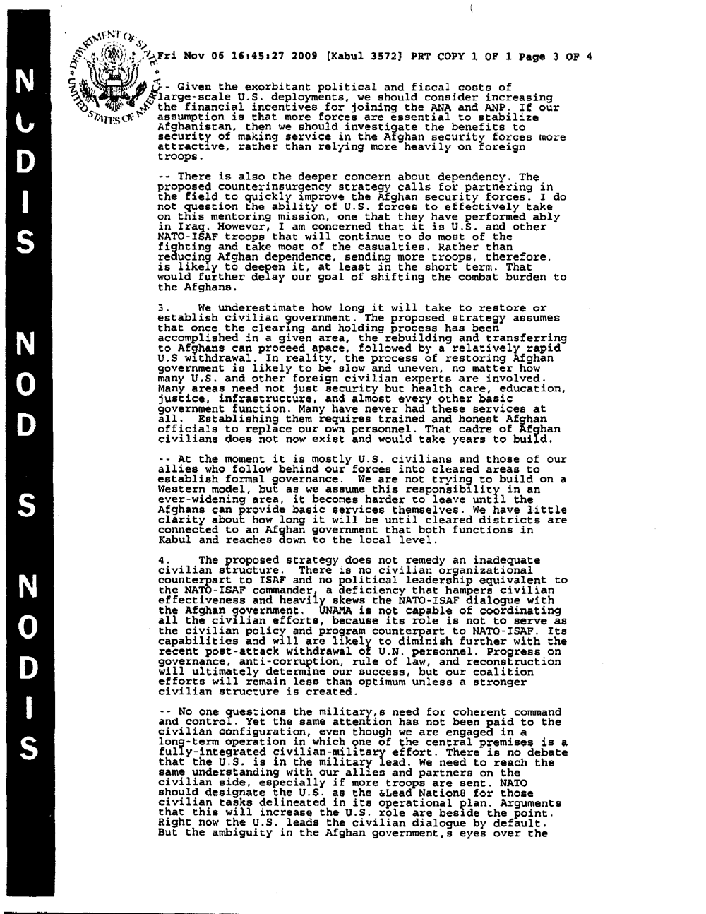 11/10/2039 REF: KABUL 3572 SECTION 01 OF 02 Kabul 3594 Classified By: Ambassador Karl W. Eikenberry, Reason 1.4 (b) and (d) Madame Secretary, My previous cable addressed concerns about taking a decision too soon on a proposed counterinsurgency strategy that relies on a large, all-or-nothing increase in U.S. troops. I now propose that the White House commission a deliberate process to lay out the range of strategic options on Afghanistan and Pakistan, broadening the analysis beyond military counterinsurgency doctrine. There are three purposes for doing so: First, to make sure that we have tested every assumption behind the Afghan-focused military counterinsurgency proposal; Second, to examine non-military alternatives or companion requirements to a major troop increase; Third, to develop U.S. political understanding and support, as well as Afghan and allied public commitment. After such a process, the standing COMISAF proposal may prove exactly what the President will decide is needed, but the time and effort put into this further deliberation will yield benefits far offsetting the costs, in my judgment. I support COMISAFs military analysis and recommendations as logical and compelling, within his narrow mandate to define the needs for a military counterinsurgency campaign within Afghanistan. But the problems confronting our own strategic purposes, as laid out by the President on March 27, are broader, and we must consider a wider set of variables before reaching a final decision. These unaddressed variables include Pakistan sanctuaries, weak Afghan leadership and governance, NATO civil-military integration, and our national will to bear the human and fiscal costs over many years. The current military proposal properly sets aside each of these issues and many more because they are outside COMISAFs counterinsurgency mandate. Yet, in reality, each has the potential to block us from achieving our strategic goals, regardless of the number of additional troops we may send. We Have Time Some argue that we must decide on the full-up troop deployment now. The military's long lead times, the requirement to bring along our NATO allies, and the need to signal decisiveness and resolve are adduced as compelling reasons to announce the full troop request quickly. I disagree. We have the time we need certainly into early next year. We must take that time to decide on the right course. As serious as the security picture in Afghanistan is today, it is not so dire that we need to announce or commit ourselves to sweeping changes immediately, either in our military or civilian posture. For example, additional combat brigades could be designated for possible deployment and begin training without requiring an immediate decision on whether to send them all. They would be arriving in increments, in any case. To show resolve, the President could announce that he was immediately ordering a smaller contingent of U.S. forces to mentor ANSF and to protect the population, while emphasizing that further deployments would be conditioned on specific steps by the Afghan government, such as a commitment and a plan to take full responsibility for national defense on a specific timeline. Afghans, allies and others in the region would see this not as indecision, but rather as seriousness of purpose. Why We Must Take the Time We have not yet conducted a comprehensive, interdisciplinary analysis of all our strategic options. Now have we brought all the real-world variables to bear in testing the proposed counterinsurgency plan. We agree that more troops will yield more security wherever they deploy, for as long as they stay. But the last time we sent substantial additional forces a deployment totaling 33,000 in 2008-2009, overall violence and instability in Afghanistan intensified. Also, neither ANSF nor the Afghan government has demonstrated the will or ability to take over lead security responsibility much less governance -- in any area cleared and held by NATO-ISAF. Experience with troop increases, therefore, offers scant reason to expect that further increases will permanently advance our strategic purposes; instead they will dig us in more deeply. We also need time to work with President Karzai and his new team, many of whom may not be in place for several months, to test whether they are both able and committed to lead the counterinsurgency mission we are defining for them. In fact, Karzai explicitly rejected the "counterinsurgency" basis and purpose of the COMISAF proposal when first briefed on it in detail two months ago, and he has not embraced it since then. Rather, in a PBS interview on November 7, Karzai sounded bizarrely cautionary notes about his willingness to address governance and corruption. This tracks with his record of inaction or grudging compliance in this area. We need an intense, high-level dialogue to judge whether we can gain enforceable commitments from the Afghan government to build their own capacity and to assume responsibility for security and governance in cleared areas. Absent such a judgment, we cannot presume that another large infusion of U.S. troops necessarily will give us leverage over them. Recommendation Hence, we recommend a comprehensive, deliberate and interdisciplinary re-examination of our strategic options, carried out by the end of the year, to decide how best to accomplish the President's March 27 strategy. This should go beyond a "war game" or "red team", yet not become a months-long Baker-Hamilton-style commission for Afghanistan and Pakistan. Rather, the White House could appoint a panel of civilian and military experts to examine the Afghanistan-Pakistan strategy and the full range of options. It could include eminent, bipartisan political figures, such as former senior U.S. government and congressional leaders. Among the issues this panel should examine are: