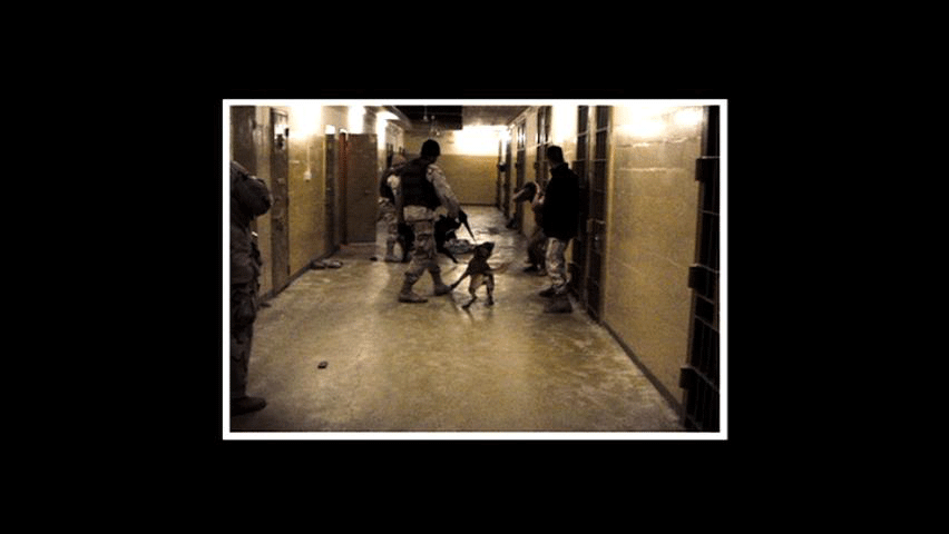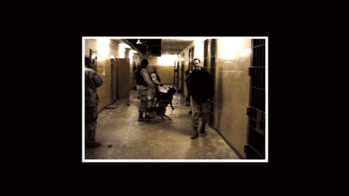 [SABRINA HARMAN, SPECIALIST MILITARY POLICE] This is the first time I've seen military police dogs here. Two dogs with two owners go to a man against the wall. The guy is scared out of his mind. The dogs get closer.