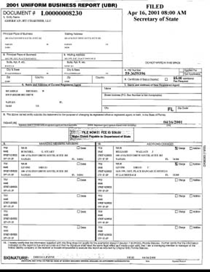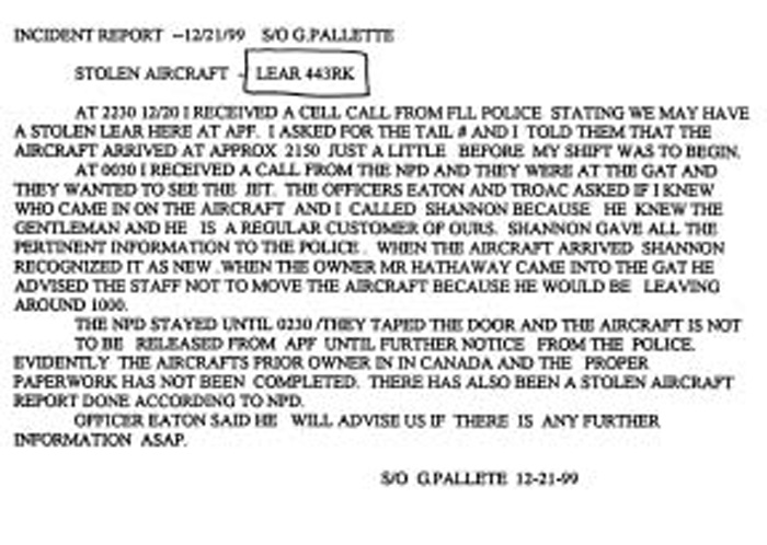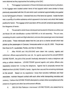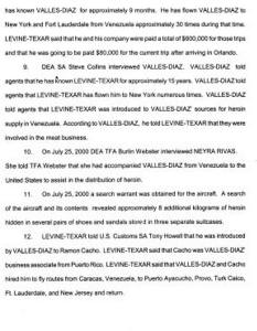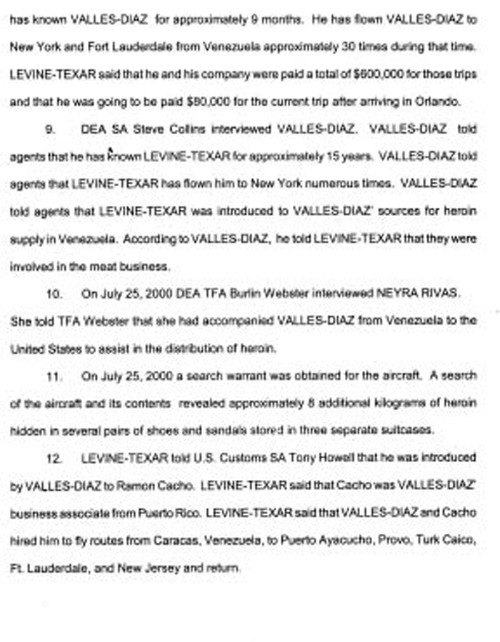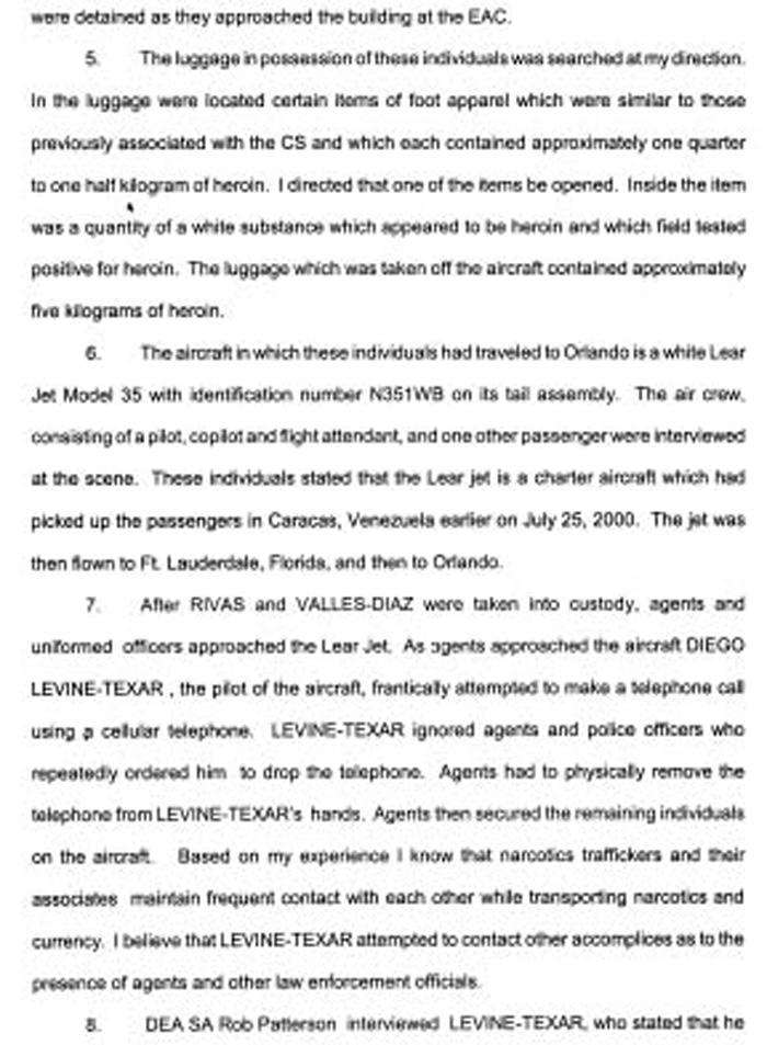 `Retired insurance executive' Wally Hilliard, who purchased a fleet of 30-40 planes after retiring to Florida, including several Lear jets like this one. DEA affidavit on the biggest seizure of heroin in central Florida history, found on Hilliard's Lear jet. STATE OF FLORIDA, COUNTY OF ORANGE CASE NO. 00-3098 AFFIDAVIT 1. I am a Special Agent (SA) with the United States Drug Enforcement Administration (DEA). I have been so employed since February 1997. Prior to my appointment as a SA, I was a Task Force Agent (TFA) with DEA from October 1990 to 1997. I was a Deputy Sheriff with the Seminole County Sheriff's Office from 1982 to 1997. My duties include investigation of violations of federal criminal drug ___ and the collection of evidence related to such investigations. 2. The information and evidence in this affidavit was gathered through my personal investigation and observations and the observations of other law enforcement agents. 3. Between July 16, and July 25, 2000, a cooperating source (CS) had a series of telephone conversations at my direction. As a result of those conversations, the CS told me that an aircraft would be able to meet him at the Orlando Executive Airport (OEA) with approximately five kilograms of heroin. The CS was to pay $40,000 from a prior heroin debt during the delivery of the 5 kilograms of heroin. 4. On July 25, 2000, I accompanied the CS to the DEA. At approximately 7:10 p.m., an aircraft approached DEA. The aircraft landed and proceeded to the Executive Air Center (EAC). The CS identified EDGAR JAVIER VALLES and NEYRA RIVAS as they were leaving the aircraft as individuals who had delivered heroin to him in similar fashion on three separate prior occasions. Both individuals had luggage in their possession. They were detained as they approached the building at the EAC. 5. The luggage in possession of these individuals was searched at my direction. In the luggage were located certain forms of foot apparel which were similar to those previously associated with the CS and which each contained approximately one quarter to one half kilogram of heroin. I directed that one of the items be opened. Inside the item was a quantity of a white substance which appeared to be heroin and which field tested positive for heroin. The luggage which was taken off the aircraft contained approximately five kilograms of heroin. 6. The aircraft in which these individuals had traveled to Orlando is a white Lear Jet Model 35 with identification number N351WB on its tail assembly. The air crew, consisting of a pilot, copilot and flight attendant, and one other passenger were interviewed at the scene. These individuals stated that the Lear jet is a charter aircraft which had picked up the passengers in Caracas, Venezuela earlier on July 25, 2000. The jet was then flown to Ft. Lauderdale, Florida, and then to Orlando. 7. After RIVAS and VALLES-DIAZ were taken into custody, agents and uniformed officers approached the Lear Jet. As agents approached the aircraft DIEGO LEVINE-TEXAR, the pilot of the aircraft, frantically attempted to make a telephone call using a cellular telephone. LEVINE-TEXAR ignored agents and police officers who repeatedly ordered him to drop the telephone. Agents had to physically remove the telephone from LEVINE-TEXAR's hands. Agents then secured the remaining individuals on the aircraft. Based on my experience I know that narcotics traffickers and their associates maintain frequent contact with each other while transporting narcotics and currency. I believe that LEVINE-TEXAR attempted to contact other accomplices as to the presence of agents and other law enforcement officials. 8. DEA SA Rob Patterson interviewed LEVINE-TEXAR, who stated that he has known VALLES-DIAZ for approximately 9 months. He has flown VALLES-DIAZ to New York and Fort Lauderdale from Venezuela approximately 30 times during that time. LEVINE-TEXAR said that he and his company were paid a total of $500,000 for those trips and that he was going to be paid $50,000 for the current trip after arriving in Orlando. 9. DEA SA Steve Collins interviewed VALLES-DIAZ. VALLES-DIAZ told agents that he has known LEVINE-TEXAR for approximateloy 15 years. VALLES-DIAZ told agents that LEVINE-TEXAR has flown him to New York numerous times. VALLES-DIAZ told agents that LEVINE-TEXAR was introduced to VALLES-DIAZ' sources for heroin supply in Venezuela. According to VALLES-DIAZ, he told LEVINE-TEXAR that they were involved in the meat business. 10. On July 25, 2000 DEA TFA Burlin Webster interviewed NEYRA RIVAS. She told TFA Webster that she had accompanied VALLES-DIAZ from Venezuela to the United States to assist in the distribution of heroin. 11. On July 25, 2000 a search warrant was obtained for the aircraft. A search of the aircraft and its contents revealed approximately 8 additional kilograms of heroin hidden in several pairs of shoes and sandals stored in three separate suitcases. 12. LEVINE-TEXAR told U.S. Customs SA Tony Howell that he was introduced by VALLES-DIAZ to Ramon Cacho. LEVINE-TEXAR said that Cacho was VALLES-DIAZ' business-associate from Puerto Rico. LEVINE-TEXAR said that VALLES-DIAZ and Cacho hired him to fly routes from Caracas, Venezuela, to Puerto Ayacucho, Provo, Turk Caico, Ft. Lauderdale, and New Jersey and return. Hilliard's partners in American Jet Charters included the pilot, suspected by the DEA of being involved but never charged, as well as a Venezuelan currently incarcerated. Hilliard's Lear jet was supplied to him by the same source that years earlier supplied a Lear to the man called the "biggest drug smuggler in American history," Barry Seal. Aviation crime. Notice of seizure of Hilliard's Lear. (top.) Another Lear jet flown to Naples by Hilliard's chief pilot was suspected of having been stolen in Canada. In business with the CIA? Hilliard owns jets worth tens of millions with a Miami man, Mark Shubin, who was a CIA U-2 pilot over Russia. UN planes? The registration numbers of s