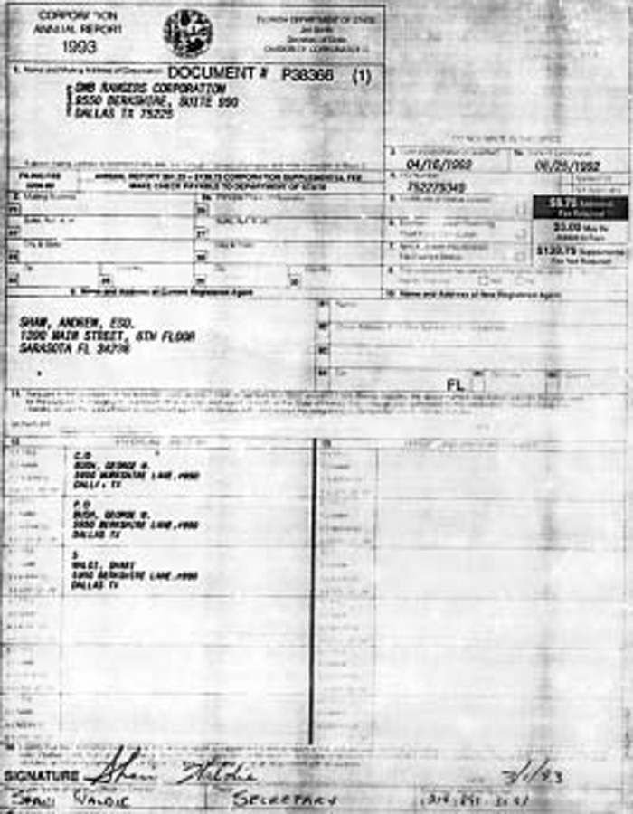 by Daniel Hopsicker At this guard shack at the Colony Beach Resort on Longboat Key in Sarasota, where President George W. Bush was staying the night before the 9/11 attack, four Arab men in a white van attempted to gain entrance using a ruse identical to that used just two days earlier to assassinate the Taliban's chief foe, Shah Massoud. A long history in the Venice Gulf Coast area: Corporate fundraising vehicle used by George W. Bush in his Texas Governor's campaign, inexplicably incorporated in Sarasota, FL. |
