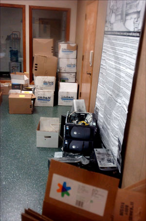 A few computers, along with boxes, are stacked up in the conference room of the From the Wilderness on Washington Street in Ashland. Photo by Orville Hector | Daily Tidings The former Los Angeles beat cop became an independent journalist to uncover government conspiracies. According to the article on his Web site, he says he has relocated to Venezuela, in part, because of a June burglary at his Ashland office. "It was the final outrage in almost three decades of attempts to silence my voice," he wrote on his Web site, ostensibly from the South American socialist nation. However, one of the founders of the local sustainability network says that his recent disappearance raises more questions about the man's mental well-being than any of the reasons Ruppert himself cites for his departure. "My feeling is he really needed a change in his life," said Michael Dawkins, a friend of Ruppert's who also facilitates a support group for depression and bi-polar disorder. "I think there is some depression or mania there." A strange burglary Ruppert's brief tenure in Ashland reached a bizarre climax with the burglary on June 26. Who committed the crime, and why, remains unsolved. Like the government conspiracy theories he often writes about, his thoughts on the burglary include twists, accusations and of course, government persecution. "There will be another time and another place, when I can and will say more about what happened," he wrote on his Web site. "Certain important events have yet to unfold, and I'm holding other key facts until the time is right. There are facts about the timing of the burglary that may eventually connect to events here in Venezuela." Ruppert said he believes a former employee, who he had fired weeks for the crime, burglarized his office. The former employee thinks she knows who committed the burglary. "I think he did that himself," she said. Ashland Police are keeping an open mind. Officers would not rule out Ruppert himself as a suspect. "At this point the case is still under investigation," Deputy Chief Rich Walsh said. "We're looking into both current and ex-employees." He added, "We'd like to find out what the purpose of moving to Venezuela was. It may have absolutely nothing to do with it but we would like to know." A troubled relationship When interviewed the morning after the alleged burglary, Ruppert said he suspected the employee of trying to use his shipping department to smuggle methamphetamine. "Her behavior was entirely consistent with meth addiction," he said, noting that some of his clues included highly erratic behavior, mood swings, poor dental hygiene and her slight figure. According to the woman, who spoke on the condition of anonymity because she fears Ruppert or his allies could try to hurt her, her accusation of sexual harassment caused her dismissal. She denies the meth accusation. "I don't know where he comes up with me being on methamphetamine," she said. Both parties admit to engaging in conduct typically deemed inappropriate at the workplace, such as conversations about sexual preferences and other flirtatious behavior. "I made the mistake of not realizing early-on that I was being harassed," the woman said in a statement made public by Victor Thorn, editor of WingTV.net. "For a while I was able just to 'laugh it off' when such comments came from Mr. Ruppert by telling myself it was just a harmless product of a patriarchal American society." Wing TV is a competing 9-11 conspiracy site. Both Thorn and Ruppert describe themselves as internet rivals. The woman said she did not provide the statement, which outlines the alleged harassment, but a friend of hers did. The friend, she said, is actually another former Ruppert staffer whom she met after leaving From The Wilderness. The morning after the alleged burglary, Ruppert discussed his troubled relationship with the former employee. Ruppert admitted to stripping down to his underpants and parading around the office while he and the woman were the only two there, an accusation the woman made in her statement. However, he said his motive wasn't sex but rather an attempt to uncover the woman's "con." "I was trying to make her show her hand because I knew she was up to something," he said while sitting in his office as Ashland Police surveyed the seven computers that were smashed with a sledge hammer in another room. "I needed to cross a line to make her show her hand." When asked if he thought this was a wise move on his part, he said, "I handled it the best way I know how. I may spend the rest of my life asking myself that question." Ruppert denies he harassed the woman, but said he was attracted to her. "Was I tempted? Sure. Did I think she was cute? Absolutely." He added, "Nothing she said rises to the level of sexual harassment. I'm a 55-year-old, divorced, healthy male who is lonely. Is that a crime?" The woman is afraid of Ruppert and fears he might harm her. She doesn't believe that he is in Venezuela. "I don't know what Ruppert is capable of," she said. "He's mental. My mom wants me to move out of town because she doesn't think I'm safe here." She said she has reported Ruppert to the state civil rights division for sexual harassment but has not pursued criminal charges. She says she is still considering a wrongful termination lawsuit against him. "I was the wrong female to mess with," she said. The government Ruppert's former employee is not the only one he blames for the alleged burglary. Ruppert also suspects the smashed computers might be related to a government plot to ruin him. "Other facts started to indicate government involvement," he wrote on his Web site. "As soon as I discovered the burglary I ran next door to the offices of the US Forest Service which shares the same building. I asked [an employee] if they had surveillance cameras covering the front of the building and our only parking lot. Reacting as though I was scaring her to death, she hastily replied, 'No'. I couldn't help but f