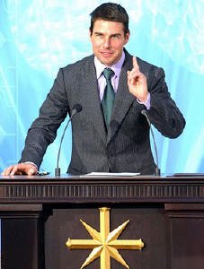 by James Verini SCIENTOLOGY -- L. RON HUBBARD'S INCORRIGIBLE BRAINCHILD Tom Cruise speaks during the September 2004 opening of a new Scientology church in Madrid June 27, 2005 | In the course of just a few months, Tom Cruise has made an astounding public leap: He has transformed himself from one of the world's biggest movie stars into one of the oddest. It's not just his sudden romance with and engagement to actress Katie Holmes, which has not yet managed to shake the air of improbability. There is also the matter of Cruise's sudden outspokenness about, and even proselytizing for, the controversial Church of Scientology, to which he's belonged for roughly 20 years. Regarding the romance -- who can explain love? It's a mystery, particularly in Hollywood, and we're unlikely to ever get the particulars about Cruise and Holmes. But the buzz in some Scientology circles is that Cruise may have reached one of the highest echelons of the Church of Scientology. While not a lot is known about this level, known cryptically as OT-VII, Scientology observers say that attaining it could explain Cruise's behavior in recent months. And that behavior has been mesmerizing: from putting up Scientology tents on movie sets to blasting Brooke Shields for using antidepressants, to promoting the church's drug-treatment programs and, generally, to hectoring anyone who challenges him. On Friday's "Today" show, after gentle prodding from Matt Lauer, he scolded, "You don't know the history of psychiatry. I do." Even his romance with Holmes has had a public Scientology veneer; Holmes has announced that she is taking Scientology courses and has added a new member to her entourage: a Scientology advisor who reportedly tells everyone she's Holmes' best friend. According to experts and the church's own literature, OT-VII ("OT" stands for Operating Thetan, "thetan" being the Scientology term for soul) is the penultimate tier in the church's spiritual hierarchy -- the exact details of which are fiercely guarded and forbidden to be discussed even among top members. It is where a Scientologist learns how to become free of the mortal confines of the body and is let into the last of the mysteries of the cosmology developed by the church's longtime leader, science fiction novelist and "Dianetics" author L. Ron Hubbard. This cosmology also famously holds that humans bear the noxious traces of an annihilated alien civilization that was brought to Earth by an intergalactic warlord millions of years ago. Lee Anne De Vette, Cruise's publicist and sister, refused requests to comment for this article. And when asked about Cruise, Ed Parkin, vice president of cultural affairs for the Church of Scientology, said only, "We do not discuss the personal religious experiences of our members with the press." Parkin also would not confirm or deny details of the OT teachings. Responding to questions about them, he wrote: "Scientology, which means 'knowing how to know,' is a religion based on the works of L. Ron Hubbard (1911-1986). Scientology addresses people as immortal spiritual beings. It gives them tools they can apply to their lives to improve conditions." But one Scientologist who left the church in 2003 after 30 years -- and who had reached the OT-VII level and become a member of the church's governing Sea Org -- said it was his understanding that Cruise was very near completing, if he had not already completed, the OT-VII level. The former Scientologist would speak to Salon only on the condition of anonymity. A current Scientologist who has reached the level OT-V, and who also spoke on the condition of anonymity, said that considering the amount of time Cruise has been in the church, an OT-VII status seems probable. And Stephen Kent, a professor of sociology at the University of Alberta who has published articles on Scientology and Hollywood, also said that Cruise's behavior strongly suggests OT-VII. Cruise is acting as though he "feels he's more in control over his environment and can convince more people to look into the organization," Kent said. "In the high OT levels one supposedly gains the skills to master one's universe. One is removing countless entities that have been holding people back. Cruise feels that he has freed himself from thousands of errant thetans, and he seems to be in a kind of euphoria he hasn't experienced before." J. Gordon Melton, the author of "The Church of Scientology" and director of the Institute for the Study of American Religion in Santa Barbara, Calif., confirmed the details of the OT teachings. "It's basically a variation of the Gnostic myth about souls falling into matter and the encumbrances that come with that," Melton said. "In the OTs, you're finding out that you're a thetan, that you've come into bodies before. Part of what you're trying to learn is exteriorization -- how to get out of your body. You also learn that you carry a lot of encumbrances from past lives." Melton, however, said that he did not believe public outspokenness about the church necessarily indicates a particular rank. The eight OT levels form the last and highest order in the intricate hierarchy Hubbard developed beginning in 1950, when his "Dianetics" was published. He named the hierarchy "the Bridge to Total Freedom." Scientologists can only enter OT once they've gone "Clear," meaning they have passed through the lower orders of the church and been shown that their personal inhibitions and flaws are the result of innumerable traumatic experiences built up over trillions of years of reincarnation. A Scientologist becomes "Clear" by taking multiple courses and through copious "auditing," a process in which they are counseled and encouraged by a more advanced church member to relive past traumas, with the help of an E-Meter, a device that Scientologists claim monitors brain activity. Before they're allowed to continue on to OT, a rigorous screening process and background check are conducted, according to Melton and others. Re