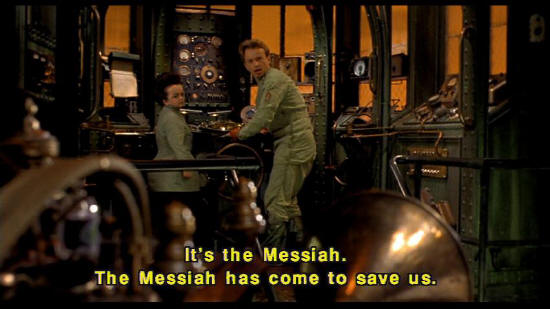 [One] What on Earth is that, Mama? It can't be a submarine. It's going through the mines. [Uncle Irvin] It's the Messiah. The Messiah has come to save us.