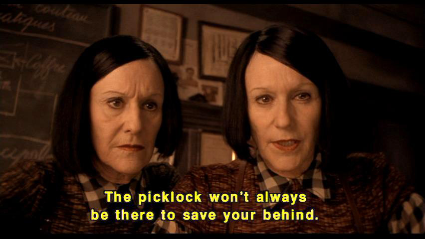 I wouldn't waste a nail to hang it up. [Jeannot] But it's pretty, isn't it? [La Pieuvre] Don't get smart with us. The picklock won't always be there to save your behind.
