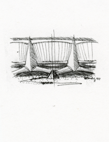 Such focalization has virtues that must be acknowledged and encouraged. (Life's virtues, by the way.) In the dynamics of life this implies a sort of three-dimensional, 24-hour frequency pulse. Residents and people outside the Hyper Building are attracted to and released from those juxtaposed focuses on such 24-hour cycles. An "automatic" consequence of this current-countercurrent flux is radial-circumferential geometry. This in turn defines the enveloping character of the exedrae, differing greatly from the "indifferent" character of the orthogonal, flat grid. 7. The sun's presence and the garments the exedrae are apt to wear in response to the sun's trajectories and seasons strongly suggest that the mentioned radial, horizontal geometry also be found on the vertical. Consequently, the exedrae lean toward the vertical axis of the tower, thus also favoring the garments display. The garments are (greenhouses) transparent or (parasols) opaque membranes according to the season. They stretch from one exedra to the other and they drape portions of the south side of the tower. 8. A series of concentric exedrae will define a third set of spaces between the indoors and the outdoors. This third kind of space via exedrae and transparent or opaque garments can modify and moderate the temperature, light, wind, and rain. Spring and fall equinox could be moments of ritual when the garments go from transparency to parasol and vice versa. The winter greenhouse mode generates large volumes of warm air. This change would also change the perception of the cityscape. Sensations, perceptions, and emotions would converge toward seasonal pageantries. 9. The self-contained, three-dimensional landscape of the city marks a clear distinction between nature and city, while putting nature and the "feet of the city" within walking distance for residents and guests. Nature is also very visible to horizon's end from the many levels of the city and from moving escalators.
