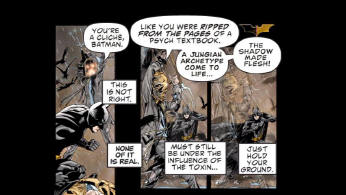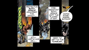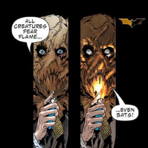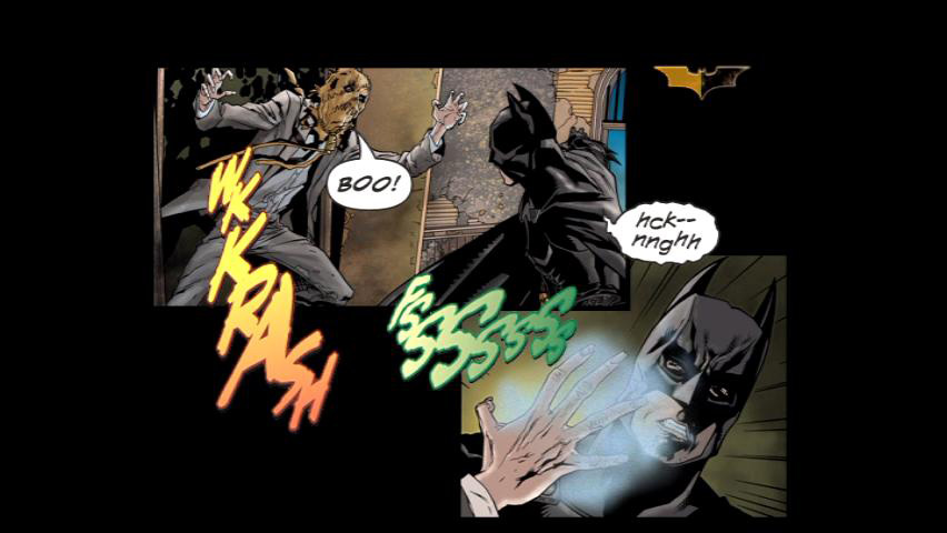 Begins -- Illustrated Screenplay & Screencap Gallery THE JOURNEY BEGINS. [Scarecrow] Boo! [WKKRASH FSSSSSSS] ]Batman] hck -- nnghh Can't breathe ... try to focus ... orient myself ... have to get out ... some kind of hallucinogen in the gas ... GOTHAM CITY RISES. Have to activate the memory fabric in my cape ... Can't use the grappling gun on my utility belt -- Damn. Only one glider wing is open ... Protective body armor absorbed the impact ... Still hurts like hell ... Fire-resistant body armor kept the flames at bay. Need to get to the Tumbler. [Scarecrow] Going somewhere, Batman? [Batman] Throat burns ... Can't breathe ... Hua-coughggh! Some kind of toxin ... The scarecrow -- again. Ra's Al Ghul -- The Demon's head. Even Carmine Falcone ... Are they all in this together? [Ducard] You've become weak, Bruce. What happened to your training? [Batman] Agh ...! [Ducard] UHNF! [Batman] Better. Keep Ra's on the offensive. Falcone can't be here -- he's supposed to be in Arkham. Have to tell Gordon ... RAchel, as well. If Falcone's escaped, she's in danger. [Scarecrow] You're a cliche, Batman. [Batman] This is not right. None of it is real. [Scarecrow] Like you were ripped from the pages of a psych textbook. A Jungian archetype come to life ... The shadow made flesh! [Batman] Must still be under the influence of the toxin ... Just hold your ground. Lean into the fear ... and let it wash over you. Have to get a sample of this toxin over to Lucius Fox ... [Alfred] Master Bruce! Are you alright? [Batman] I'm fine now, Alfred. [Scarecrow] All creatures fear flame ... Even Bats!