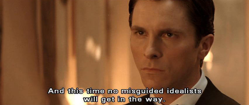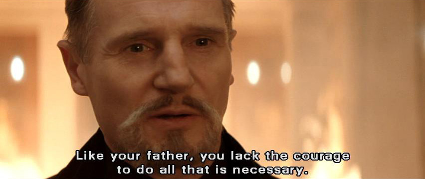 Their deaths galvanized the city into saving itself, and Gotham has limped on ever since. We are back to finish the job. And this time no misguided idealists will get in the way. Like your father, you lack the courage to do all that is necessary. If someone stands in the way of true justice, you simply walk up behind them and stab them in the heart.