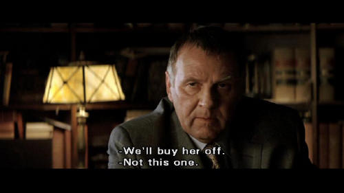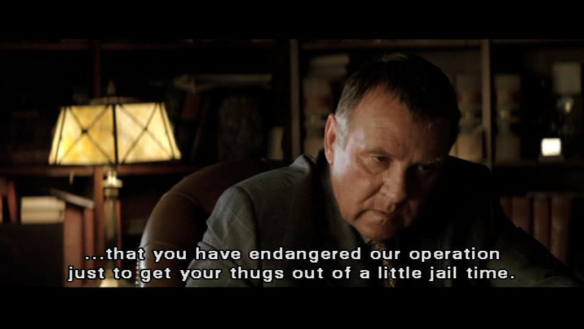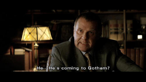 But you know who I'm working for, and when he gets here -- [Falcone] He -- He's coming to Gotham? [Crane] Yes, he is. And when he gets here, he's not going to wanna hear ... that you have endangered our operation just to get your thugs out of a little jail time. [Falcone] Who's bothering you? [Crane] There's a girl at the DA's office. [Falcone] We'll buy her off. [Crane] Not this one.
