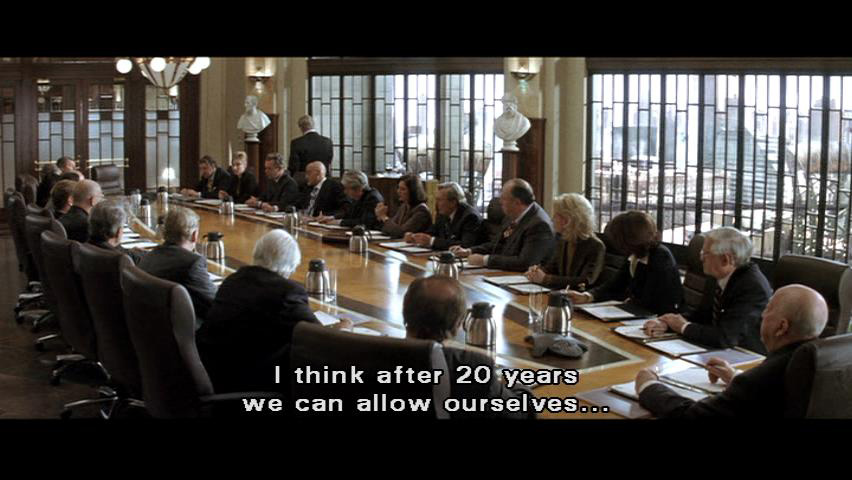 [Fredericks] I don't think Thomas Wayne would have viewed heavy arms manufacture ... as a suitable cornerstone for our business. [Earle] Well, that's 20 years ago, Fredericks. I think after 20 years we can allow ourselves ... to stop thinking about what Thomas Wayne would have done. [Secretary] Good morning, Mr. Earle's office.