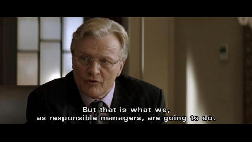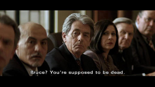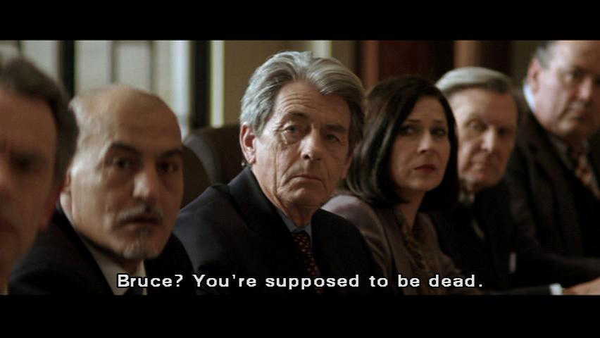 But that is what we, as responsible managers, are going to do. Jessica? Jessica? Where are you? [Bruce] Eye on the ball, and ... [Earle] Why is no one answering the phone? [Bruce] It's Wayne Enterprises, Mr. Earle. I'm sure they'll call back. [Earle] Bruce? You're supposed to be dead.