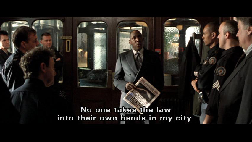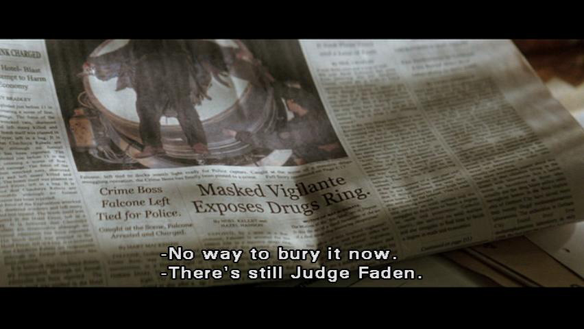 Yeah? [Gordon] This guy did deliver us ... one of the city's biggest crime lords. [Loeb] No one takes the law into their own hands in my city. Understand? [Rachel] No way to bury it now. [Finch] There's still Judge Faden. Masked Vigilante Exposes Drugs Ring; Criime Boss Falcone Left Tied for Police.