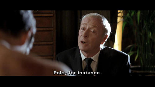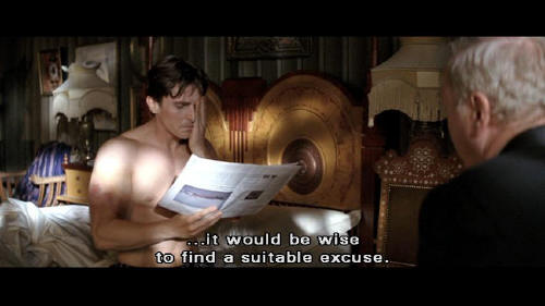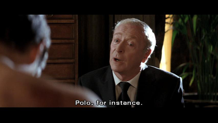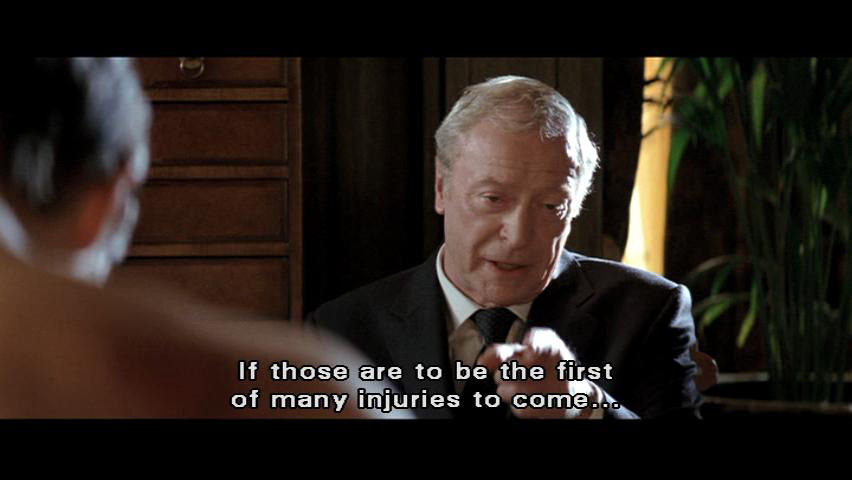 [Bruce] Theatricality and deception ... are powerful weapons, Alfred. This is a good start. [Alfred] If those are to be the first of many injuries to come ... it would be wise to find a suitable excuse. Polo, for instance. [Bruce] I'm not learning polo, Alfred.