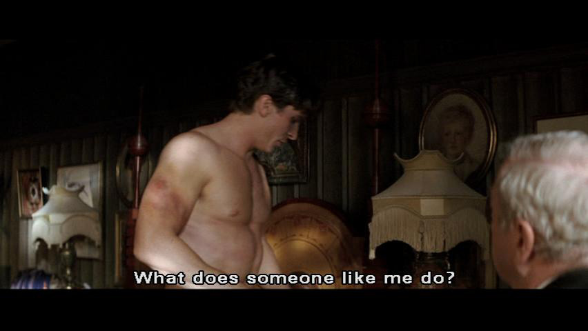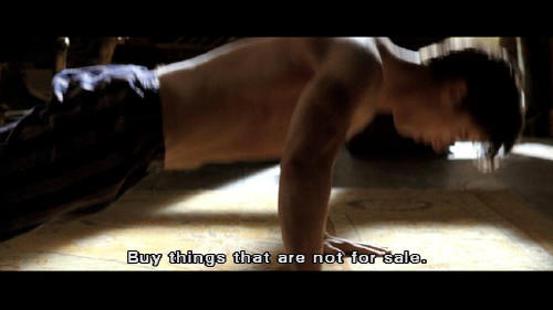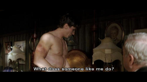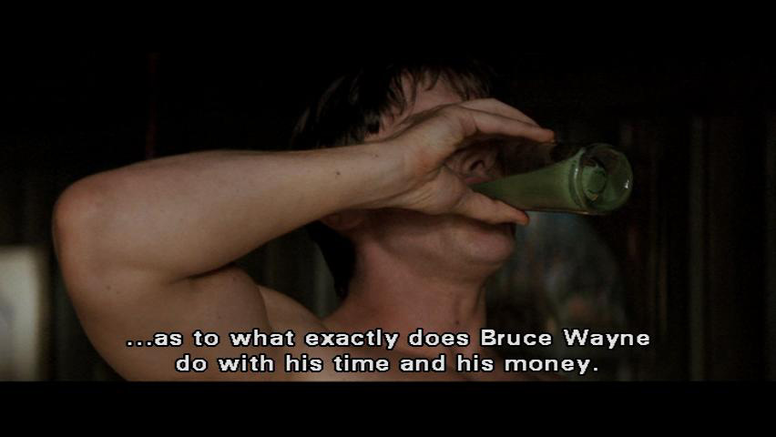 [Alfred] Strange injuries, a nonexistent social life. These things beg the question ... as to what exactly does Bruce Wayne do with his time and his money. [Bruce] What does someone like me do? [Alfred] Drive sports cars, date movie stars. Buy things that are not for sale. Who knows, Master Wayne, you start pretending to have fun ...
