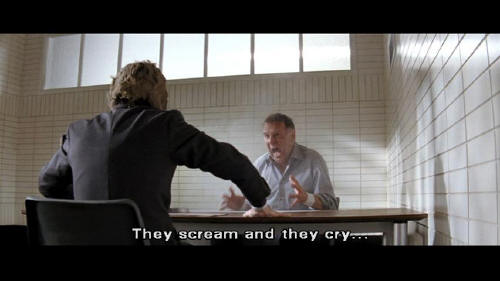 [Falcone] So when did the nut take over the nut house? [Crane] They scream and they cry ... much as you're doing now. [Crane] Well, he's not faking. Not that one. I'll talk to the judge and see if I can get him moved ... to the secure wing at Arkham. I can't treat him here.