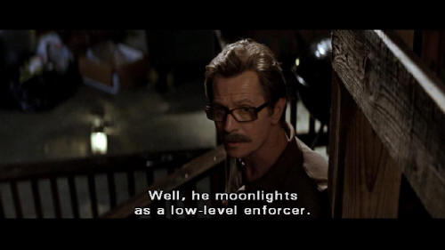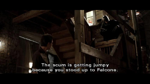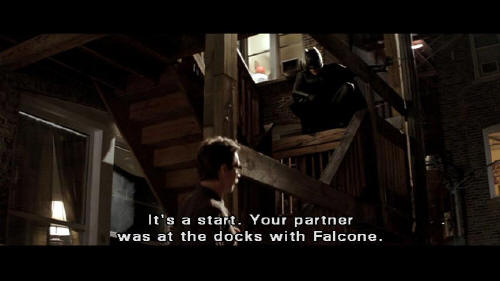 [Batman] Storm's coming. [Gordon] The scum is getting jumpy because you stood up to Falcone. [Batman] It's a start. Your partner was at the docks with Falcone. [Gordon] Well, he moonlights as a low-level enforcer. [Batman] They were splitting the shipment in two. Only half went to the dealers.