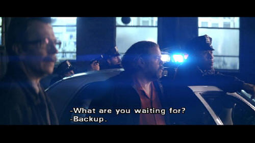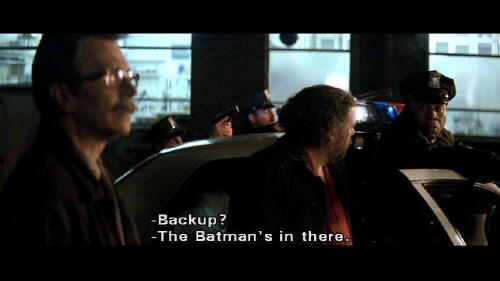 [Flass] What are you waiting for? [Police] Backup. [Flass] Backup? [Police] The Batman's in there. SWAT's on the way. But if you wanna go in now ... I'll be right behind you, sir. [Flass] SWAT's on the way.