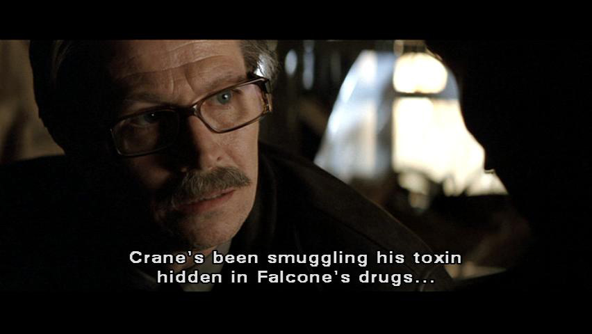 Crane's been smuggling his toxin hidden in Falcone's drugs ... and they're dumping it into the water supply. [Gordon] What was he planning? [Batman] I don't know. [Gordon] Was he working for Falcone? [Batman] He mentioned someone else, someone worse.