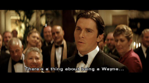 I want to thank you all for coming here tonight and drinking all of my booze. No, really. There's a thing about being a Wayne ... that you're never short of a few freeloaders, like yourselves ... to fill up your mansion with. So here's to you people. Thank you. [Fredericks] That's enough, Bruce. [Bruce] I'm not finished.