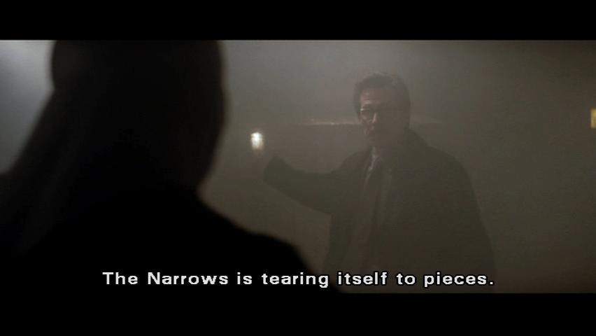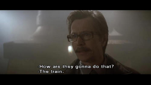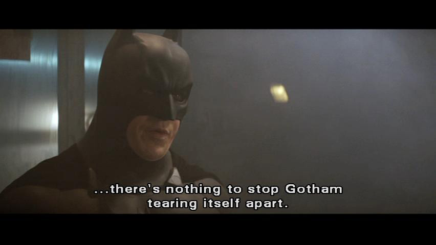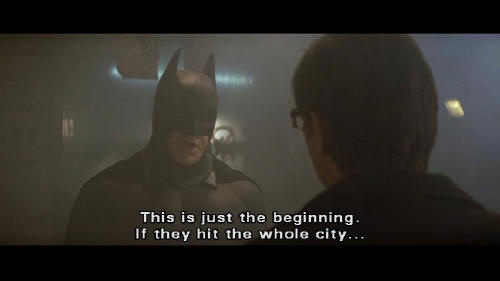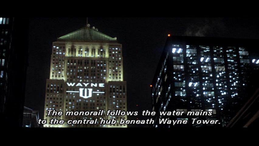The Narrows is tearing itself to pieces. [Batman] This is just the beginning. If they hit the whole city ... there's nothing to stop Gotham tearing itself apart. [Gordon] How are they gonna do that? [Batman] The train. The monorail follows the water mains to the central hub beneath Wayne Tower.
