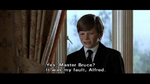 [Alfred] I thought I might prepare a little supper. Very well. [Bruce] Alfred? [Alfred] Yes, Master Bruce? [Bruce] It was my fault, Alfred. I made them leave the theater. [Alfred] No.