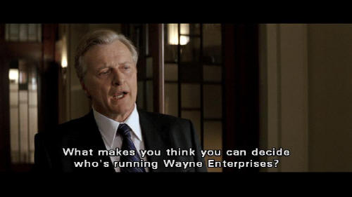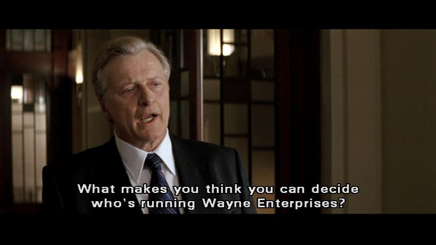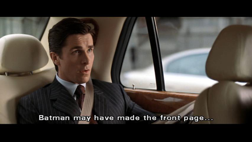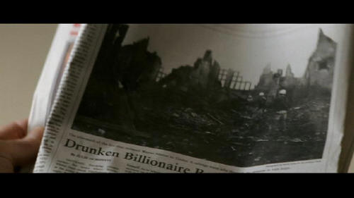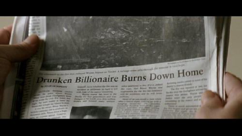 [Alfred] Batman may have made the front page ... but Bruce Wayne got pushed to page eight. Drunken Billionaire Burns Down Home [Bruce] Bruce Wayne. [Earle] What makes you think you can decide who's running Wayne Enterprises?