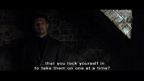 [Bruce] Why? [Guard] For protection. [Bruce] I don't need protection. [Guard] Protection for them. Get in. [Henri Ducard] Are you so desperate to fight criminals that you lock yourself in to take them on one at a time? [Bruce] Actually, there were seven of them.