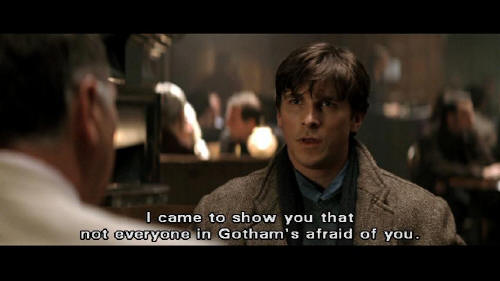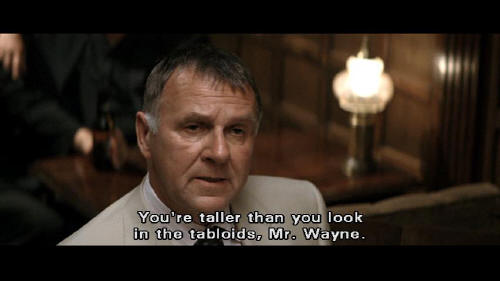 [Falcone] You're taller than you look in the tabloids, Mr. Wayne. No gun? I'm insulted. You could've just sent a thank-you note. [Bruce] I didn't come here to thank you. I came to show you that not everyone in Gotham's afraid of you. [Falcone] Only those who know me, kid.