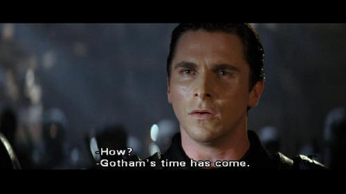 [Ra's al Ghul] You cannot lead these men ... unless you are prepared to do what is necessary to defeat evil. [Bruce] And where would I be leading these men? [Ra's al Ghul] Gotham. As Gotham's favored son ... you will be ideally placed to strike at the heart of criminality. [Bruce] How? [Ra's al Ghul] Gotham's time has come.