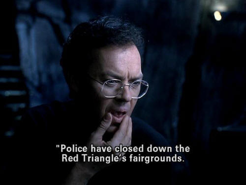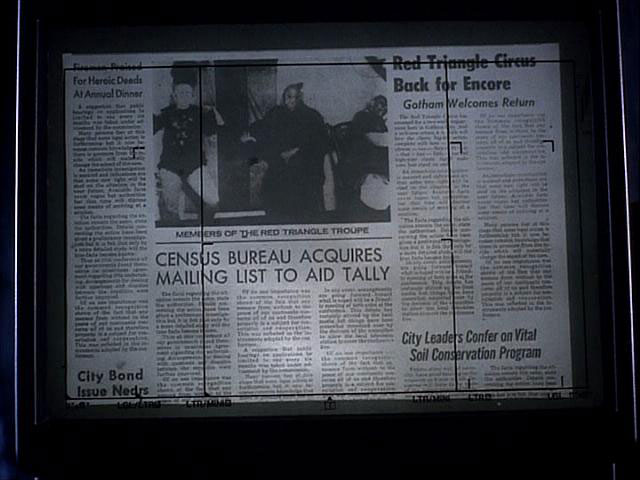[Bruce] "Featuring a poodle lady ... [Bruce] " ... the world's fattest man ... [Bruce] " ... and Aquatic Bird Boy." [Bruce] "Circus folded its tents yesterday ... [Bruce] " ... after reports of missing children in several towns. [Bruce] "Police have closed down the Red Triangle's fairgrounds. [Bruce] "However at least one freak show performer vanished before ...