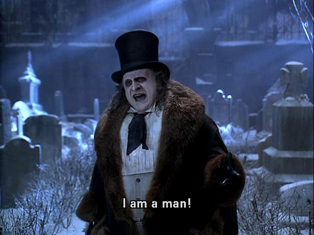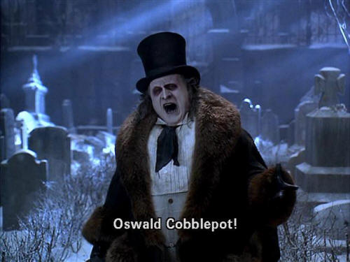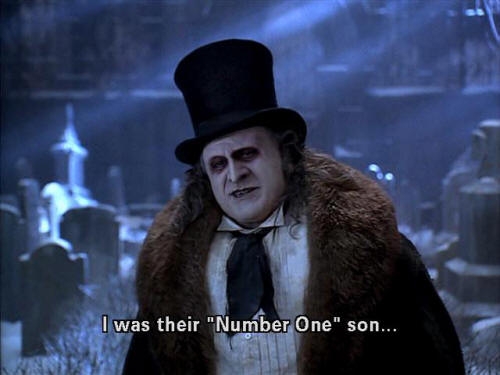 [Penguin] A penguin is a bird that cannot fly! [Penguin] I am a man! [Penguin] I have a name! [Penguin] Oswald Cobblepot! [Reporter] You'll never be able to settle with them? [Penguin] True. [Penguin] I was their "Number One" son ... [Penguin] .. and they treated me like number two.