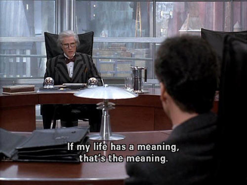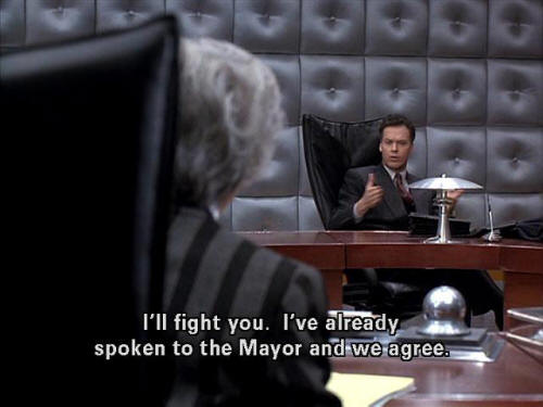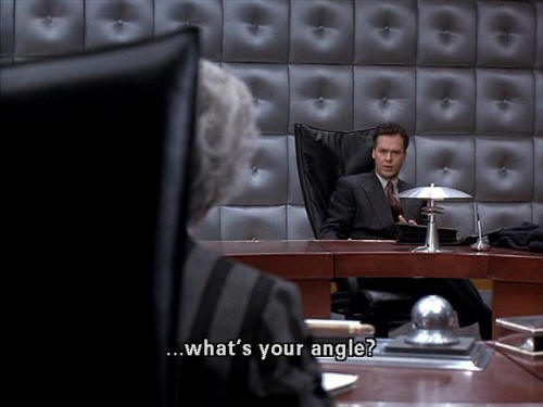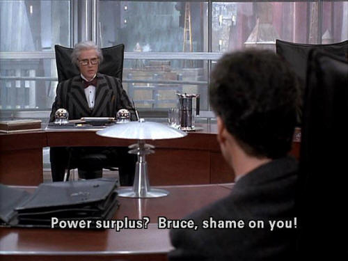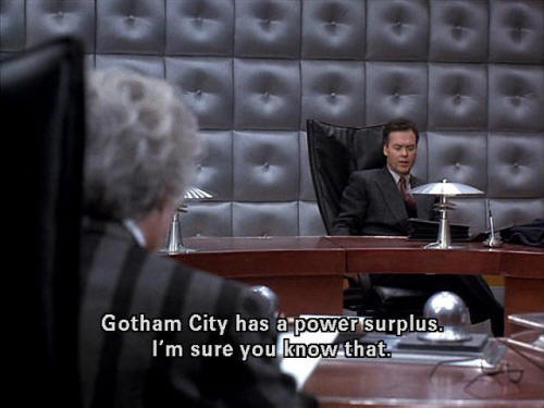 [Bruce] Gotham City has a power surplus. I'm sure you know that. [Bruce] My question is .... [Bruce] ... what's your angle? [Shreck] Power surplus? Bruce, shame on you! [Shreck] No such thing. One can never have too much power. [Shreck] If my life has a meaning, that's the meaning. [Bruce] I'll fight you. I've already spoken to the Mayor and we agree. [Shreck] Mayors come and go.