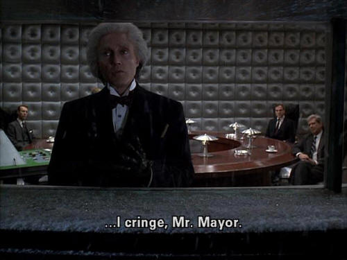 [Shreck] ... a Gotham City ... [Shreck] ... of the future, lit up like a blanket of stars ... [Shreck] ... but blinking on and off ... [Shreck] ... embarrassingly low on juice. [Shreck] Frankly ... [Shreck] ... I cringe, Mr. Mayor. [Mayor] Sorry, any plans must go to the usual committees ... [Mayor] ... through the usual channels.