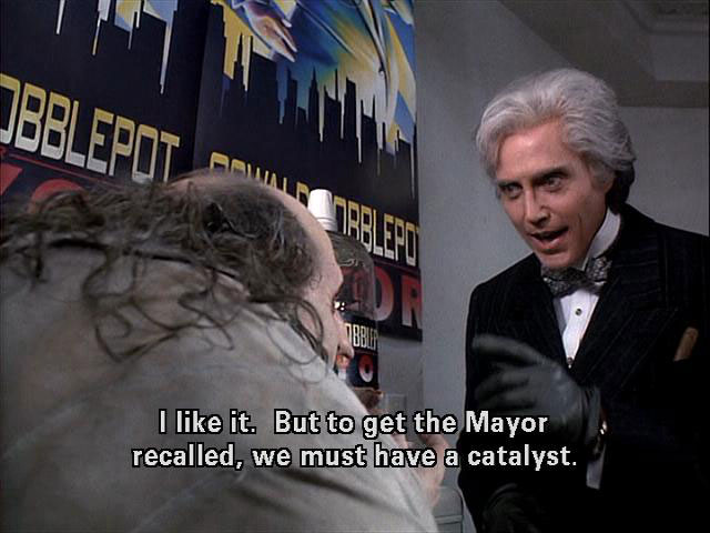 [Penguin] I'd like to fill her void. [Penguin] A platform? [Penguin] Stop global warming. Start global cooling. Make the world an icebox. [Shreck] I like it. But to get the Mayor recalled, we must have a catalyst. [Shreck] Soon, an incident like the Gulf of Tonkin, or the Reichstag fire ... [Shreck] Sidetracked? This is your chance to fulfill a destiny ... [Penguin] Burn, baby, burn!!