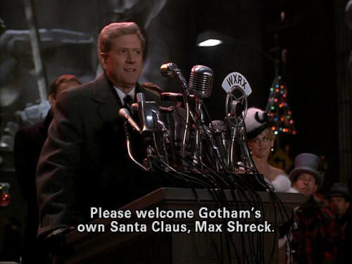 [Mayor] Please welcome Gotham's own Santa Claus, Max Shreck. [Shreck] Santa Claus? [Shreck] Afraid not. [Shreck] I'm just a poor schmo. Got lucky. [Shreck] Sue me ... [Shreck] ... if I want to give some back. [Shreck] I only wish I could hand out more than just ... [Shreck] ... expensive baubles.