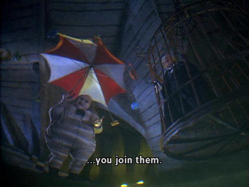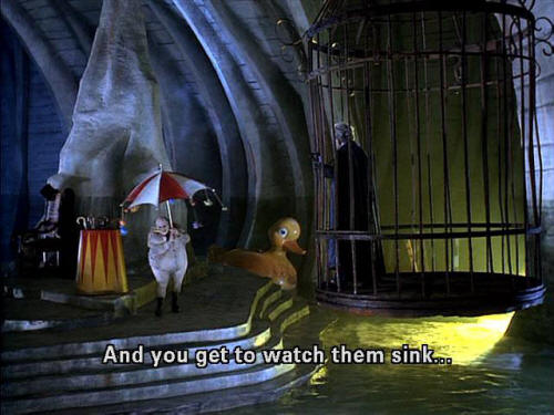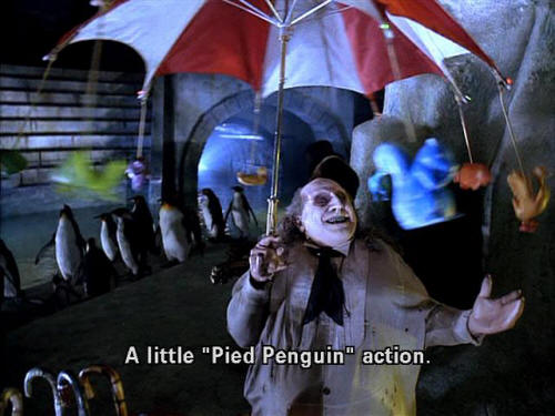 [Penguin] You asked me ... how do I lure them in? [Penguin] A little "Pied Penguin" action. [Penguin] And you get to watch them sink ... [Penguin] ... into a deep puddle ... [Penguin] ... of your industrial by-products. [Penguin] Then ... [Penguin] ... you join them.