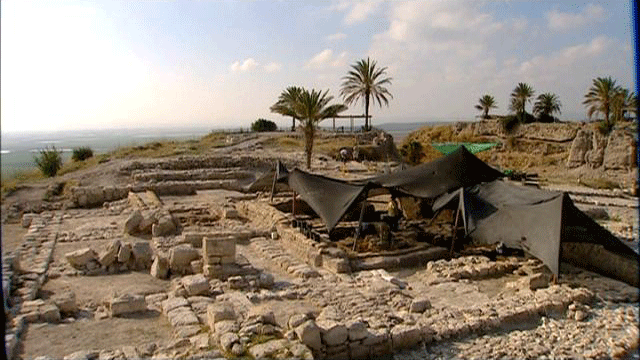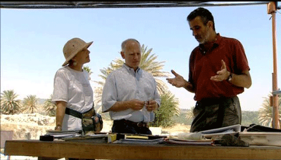 [Israel Finkelstein] So here's the situation: If we have the mound of Megiddo, and we partition it into [inaudible], okay -- the two strata -- this one was supposed to be in the 11th century B.C., and now according to the hydrocarbon results we definitely see that this is impossible. That it falls into the 10th century. And the meaning is, that the strata which had been dated to the 10th century, cannot be 10th century, it goes to the 9th century B.C. [Neil Silberman] Yep! [Narrator] That is a whole century after Solomon. A set of certitudes based on deductions have COLLAPSED. The pieces of the puzzle no longer fit together. After our reconsideration of David's empire [?], it is now Solomon's turn. [Neil Silberman] What is the situation with the 10th century now? [Israel Finkelstein] It's confusing. In Jerusalem, it's a small village. Nothing monumental. No REAL evidence for a big capital.