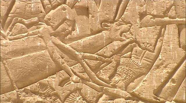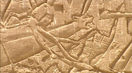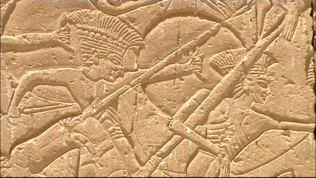 They are wearing plumed helmets with chin-straps, and sometimes strange horned helmets. A visual account of the horrors of a battle. In less than one century -- the 12th -- the Sea Peoples occupied the entire coast. [Israel Finkelstein] It would be a mistake to understand every single destruction of a Canaanite city-state as a result of an attack by the Sea People. The entire eastern Mediterranean was in a complete turmoil. The economy was destructed, maritime trade routes were cut, ports on the Mediterranean coast were destroyed, were attacked and taken. In a situation like this, of economy falling, famine, political dysfunction, then one city can attack another; a gang of people from the highlands can take a city; pastoral nomads can come also and try to gain some advantage by attacking a single city, isolated city. Everything was in chaos. [Narrator] While the city-states were collapsing, one-by-one, another development was secretly unfolding in the highlands.