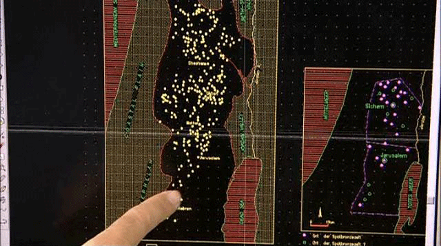 This type of research is based on statistical methodology. The location of remains and concentrations of fragments are transferred onto a map of the area. This allows a reconstruction of how a given territory was occupied, the size of sites, their number, and their evolution over time. In this way, the highlands were inspected with a fine-tooth comb. THE RESULTS WERE AMAZING! Between the 12th and 10th centuries B.C., almost 250 villages were to be found in the highlands of central Canaan. This occurred without the slightest trace of a military conquest. It was a social transformation that was gradual, but nevertheless RADICAL. [Israel Finkelstein] So what we see here is the entire map of all the surveys of many years in the highlands, from south to north.
