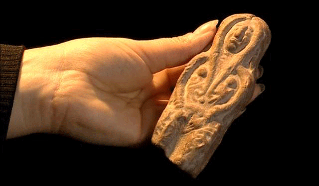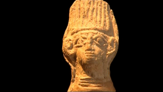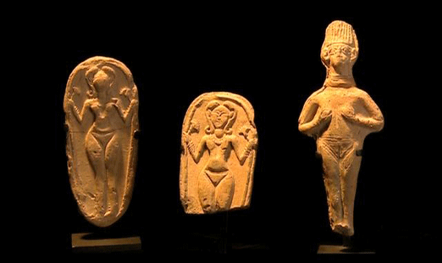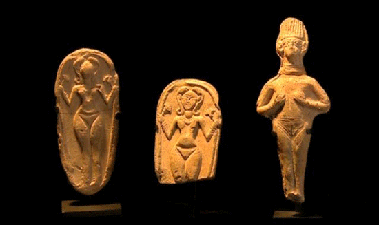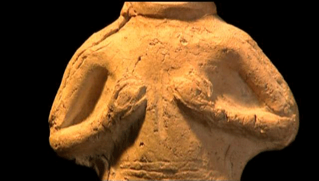 fertility goddesses, companions of gods, and animal incarnations of the divinities. They are to be found both in Canaanite sites from the Bronze Age, and in sites from THE ISRAELITE ERA [?], in the Iron Age. [Amihai Mazar, Hebrew University of Jerusalem] WE HAVE VERY, VERY LITTLE INFORMATION about the religion. One of them I published, I found once in a kibbutz, in Galilee, not far from here -- Kibbutz Shamir. I visited and found on a shelf there a bronze figure of a bull.