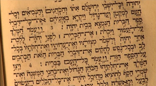[Narrator] Writing had just expanded beyond the circle of scribes. Of course, public readings of The Book [according to THE BIBLE] discovered in the temple do not PROVE the degree of literacy of the population of Judah. But they do show the function that the written word had attained in 7th century society. [?] In the small state of Judah, under the reign of Josiah, a revolution had been launched [according to THE BIBLE]. [William M. Schneidewind, University of California, Los Angeles] The fact that a sacred, written text emerged from a pastoral, agrarian society is A WATERSHED OF WESTERN CIVILIZATION [???] NEVER BEFORE IN HUMAN HISTORY had societies had sacred texts that were AUTHORITATIVE! Most near eastern civilizations had texts only for governments, for writing. Authority, cultural authority, religious authority was passed from family to family, through oral tradition. It wasn't passed by reading texts or appealing to the authority of text. THE FIRST TIME IN HUMAN HISTORY that we have the authority of human texts is with the Josianic [?] religious reforms where they appeal to the authority of a written text, and have that written text as a binding authority for the entire culture, for all people, as opposed to the authority of the family and the tradition. And this is A WATERSHED OF WESTERN CIVILIZATION. [Israel Finkelstein] In the 7th century B.C., EVERYTHING MERGES. Everything IS RIPE for something new. When we look at the politics of the time, the economy of the time, the social situation in Judah, even the fact that literacy spreads from the center to the countryside to the villages, to the relatively simple people, what we see is a situation in which JUDAH PUTS EVERYTHING IN THE WRITTEN WORD, IN A BOOK. Judah describes its past -- MYTHICAL OR HISTORICAL. It tells us about the present and it gives us THE DREAMS FOR THE FUTURE in the shape of the written word of a book. And this is something new in the history of the human adventure. [?] [Narrator] [According to the Bible], based on this legitimacy, founded on a common law and history, Josiah was able to lead the population in his ambitious plan. But THE DREAM OF A GREAT KINGDOM that would UNITE the people of Israel and Judah for the first time ever was not to be. Josiah died before he was able to accomplish it, killed by Pharaoh Necho II. His end is related IN THE BIBLE in a few lines: "And the worst was yet to come." In 597 B.C., the Babylonians wreaked havoc in the kingdom [?] of Judah for the first time.