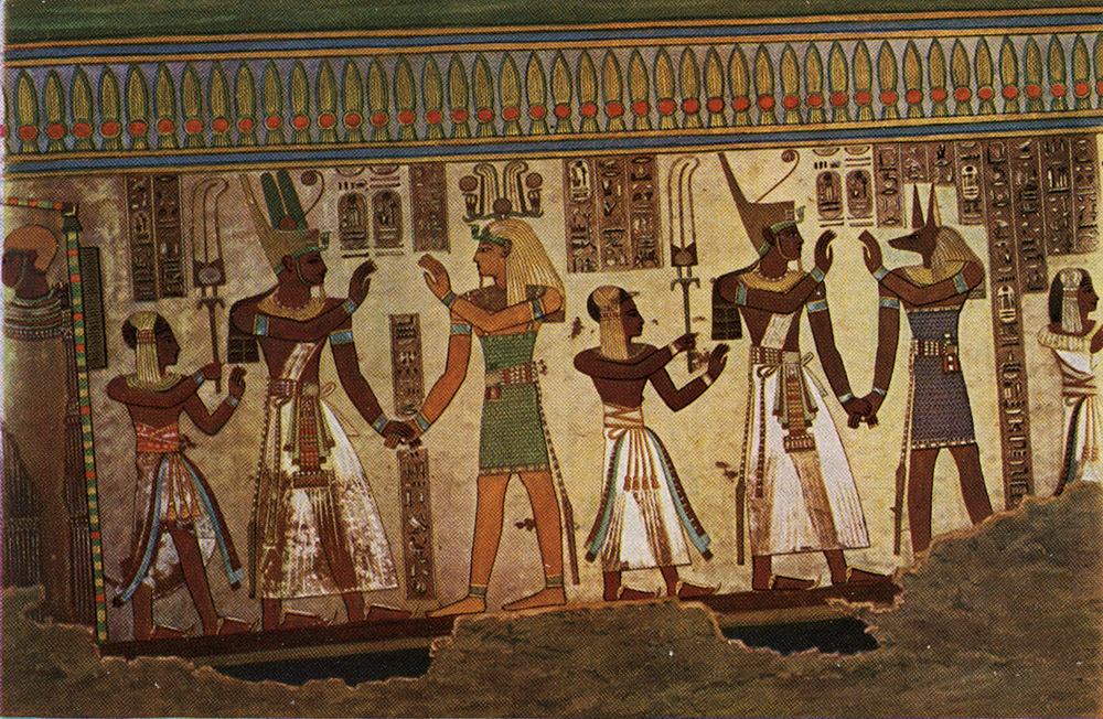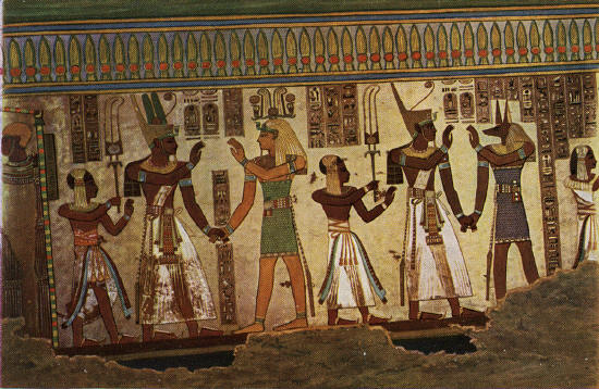 15 - (Thebes) -- The Tombs of the Queens and Princes -- Tomb of Prince Amenkhepeshef. -- King Rameses IIIrd is seen burning incense before a shrine in which stands the God Ptah. Next, the king is introducing his son, the Prince Amenkhepeshef, to another form of Ptah, the Vulcan of the Egyptians. Then he is seen presenting him to the jackel-headed Duamutef, who leads them both forward towards the inner chambers of the tomb. At the end of the photo, Amseth meets them and conducts them forward.