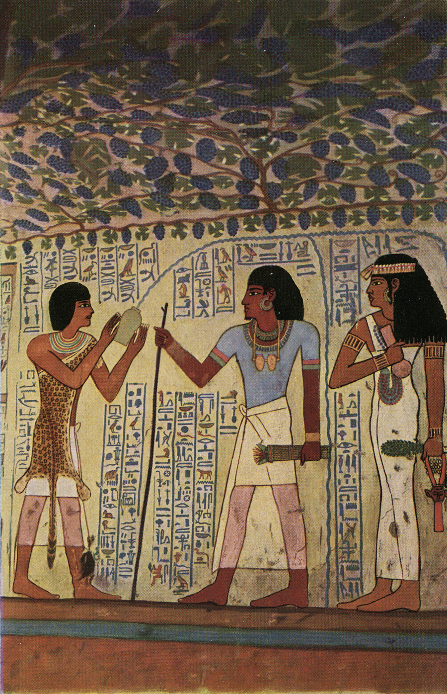 17 - (Thebes) The Mortuary Chapels of the Nobles-Tomb and Mortuary Chapel of the Noble Sennefer. -- Sennefer and his sister Meryt, standing before a quantity of offerings presented by a priest clad in a leopard-skin. Then they are both seen purified with holy water by a priest connected with the mortuary temple of Thothmes IIIrd. Strange to note that, on one of the amulets around the neck of the figure of Sennefer, the name of "Alexander" is written in hieroglyphs; this would lead one to suppose that the tomb was open in the Greek period, and was visited by a person of that name.
