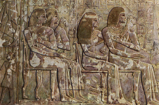24 - (Thebes) The Mortuary Chapel of Ramose, Vizir of Egypt during the early years of Amenhotep the Fourth (Akhnaton). -- A representation of Ramose seated beside his wife Ptahmeryt, behind whom are Amenhotep, the brother of Ramose, and his daughter very beautifully and delicately executed in relief, and cut in the natural lime stone. It is worth while to note that the reliefs have never been painted according to the usual custom, and that the eyes are painted in thin black lines pointed at the ends.