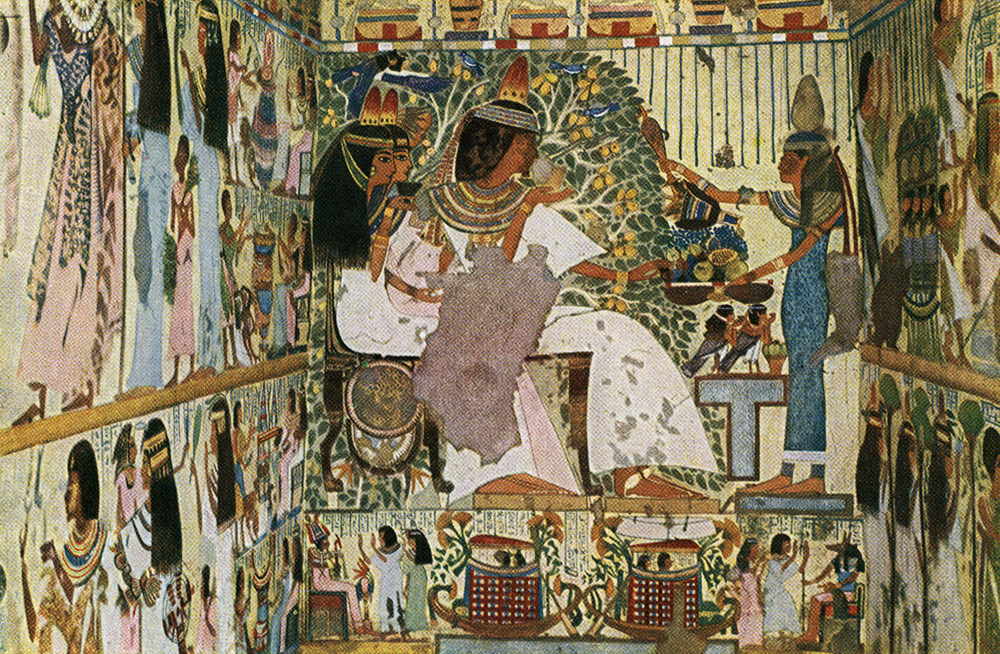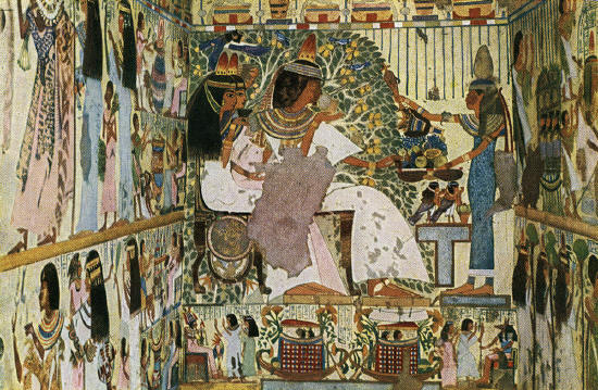 25 - (Thebes) Mortuary Chapels of the Nobles -- The Mortuary Chapel of Userhat (a tutor and scribe in the reign of Amenhotep the Second -- B.C. 1448). Userhat is seen seated with his wife and sister on elaborate chairs in Paradise under a fig-tree burdened with fruit, amidst which the wagtails flit. They are resting their feet on wooden boards and drinking the water of life from golden cups. There are garlands of flowers under the chairs with which they may deck themselves. Above the two women, their souls flutter in the form of human-headed birds. To them a tree-goddess, who rises out of the lake, which lies before them, offers bread, figs, grapes, a honey-comb, and pours from a vase the water which they are drinking. Userhat stretches out his hand to take one of the figs. Between him and the goddess, the "T" shaped lake is to be seen at which the souls of Userhat and his wife, in the form of semi-human birds, drink the water from the hollow of their hands.